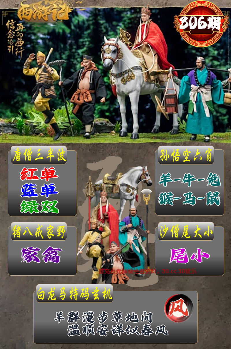 | 307期:解西游记转寄【腾】 白龙马玄机:奔腾草野步声急,追踪妖邪不放松。 孙悟空六肖:狗鼠羊马猴龙 唐僧三半波:红双+蓝双+绿单 猪八戒家野:家禽  |